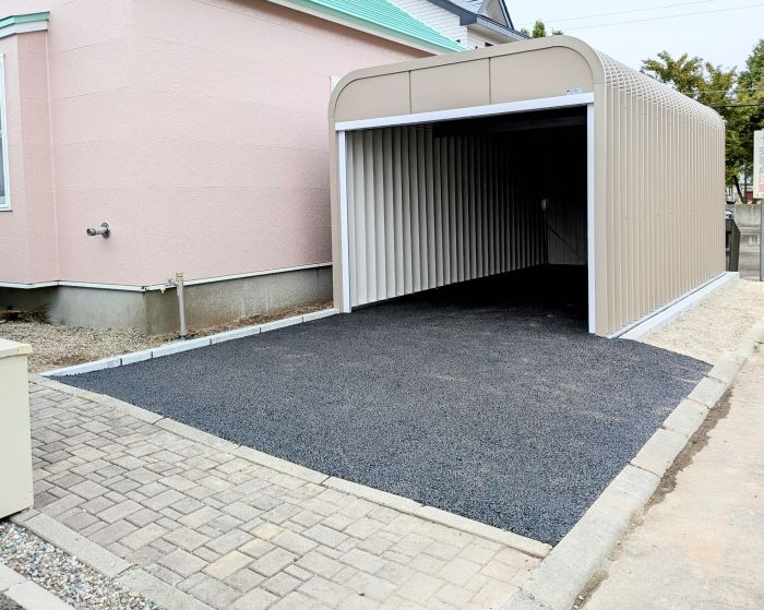 北海道でカーポート、ガレージを選ぶ基準となるのは耐積雪量です。1台用の屋根はおおよそ16.5㎡ありますが、湿った雪が50㎝積もると3トン近い重量が載っていることになります。 カタログに記載されている耐積雪量は軽い雪を想定しており、弊社の営業地域では耐積雪量1m以上(重たい雪では50㎝)の製品をお勧めしております。 四方を壁で囲まれているガレージは高い防犯性、また雨、風、UVからお車を守ってくれるといったメリットがある一方、遮蔽により重苦しい景観になる事があります。 その点カーポートは見通しが利くので、建てる位置を気にしなくて済むといったメリットがあります。 どちらを選ぶかはお客様のライフスタイルによるところです。 弊社では全メーカーを取り扱っております。古いガレージ等の取り壊しも特価で承っておりますので、是非お問い合わせ下さい。 |